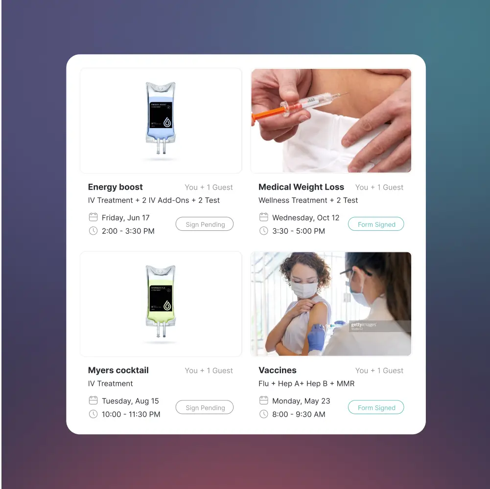 Mobile wellness can come with a lot of red tape. The HIPAA compliant integrated EMR lets wellness providers see a patient’s medical history, check telehealth notes, get signed consent forms, and record treatments while they are with the patient.